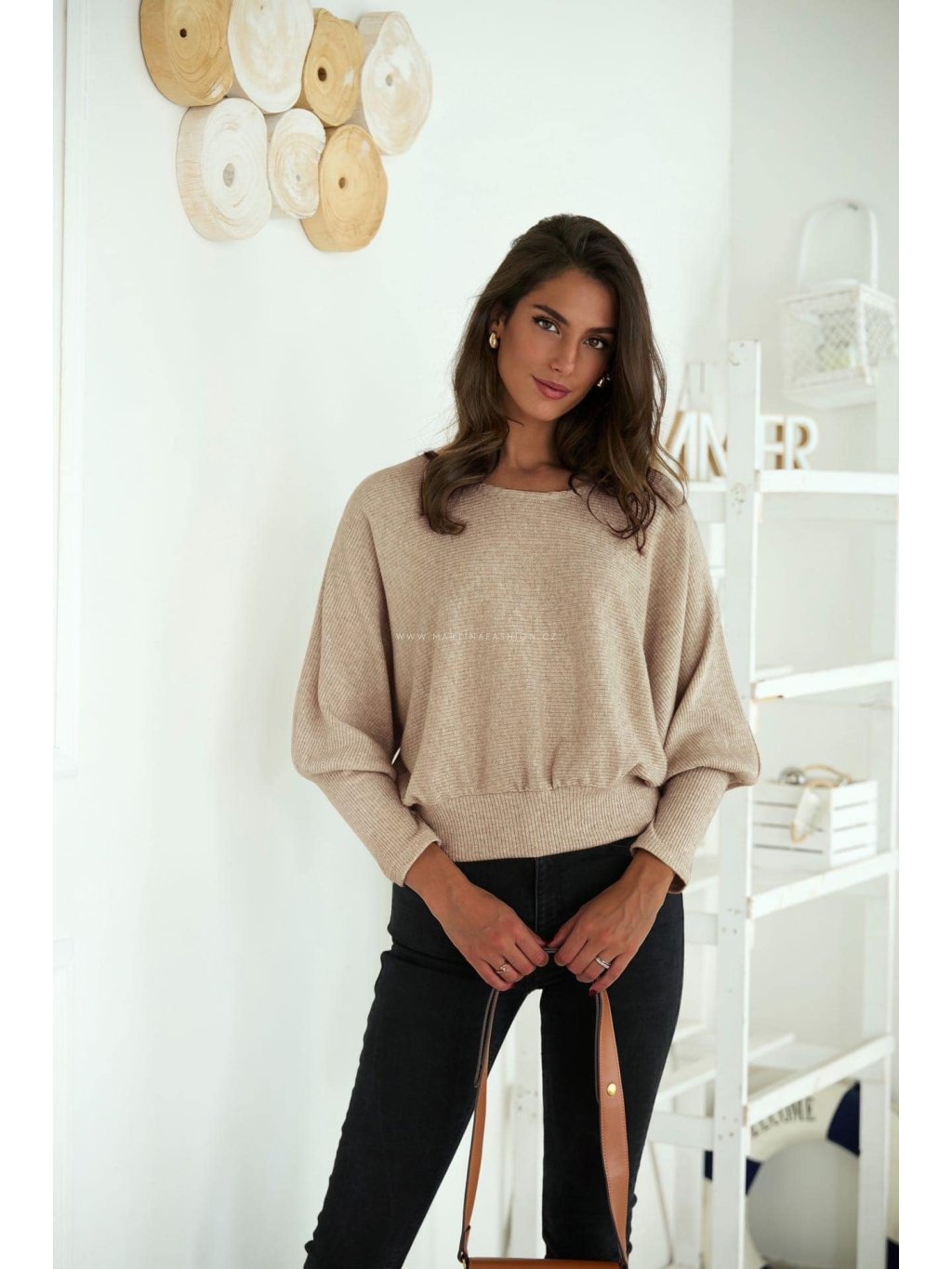Volnější svetr s netopýřím střihem rukávů a příjemně měkkým povrchem. V oblasti pasu a na koncích rukávů má vyšší lem, díky kterému hezky drží tvar. Látka je hladká, elastická a má lehký třpyt.