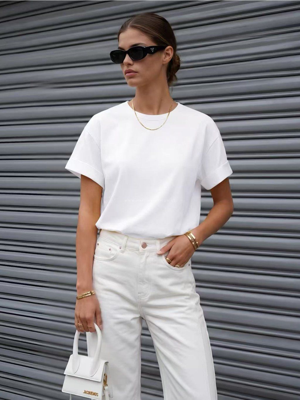 Jednoduché bílé basic tričko, které by nemělo chybět v žádném šatníku. Čistý střih bez potisku působí svěže a upraveně a snadno ho sladíte s džínami, elegantními kalhotami i sukní. Bavlna s příměsí elastanu je měkká, prodyšná a příjemně pružná, takže se tričko pohodlně přizpůsobí postavě a drží tvar. Kulatý výstřih je klasický a lichotivý, rukávy mají pohodlnou délku.