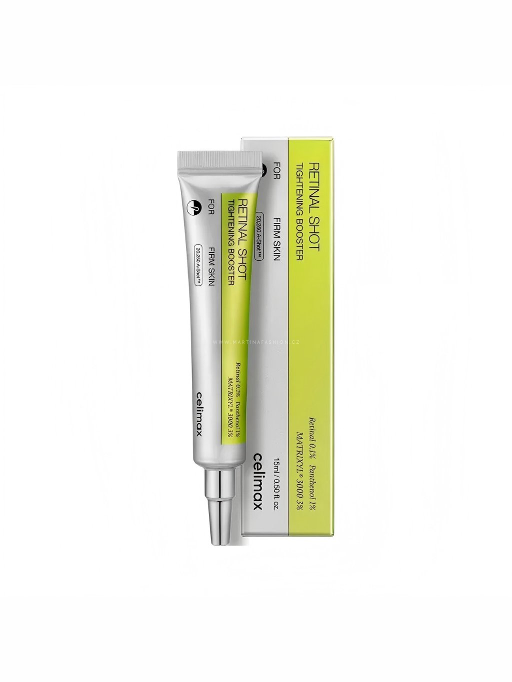 Celimax Retinal Shot Tightening Booster je moderní péče s nano-retinalem — pokročilejší formou vitaminu A, která napomáhá jemnější a rovnoměrnější pleti, aniž by pokožku zbytečně zatěžovala.