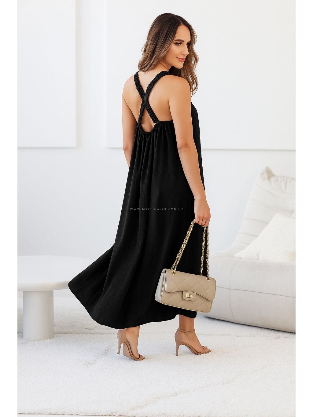 Maxi šaty na ramínka jsou dokonalou volbou pro horké letní dny i večerní procházky. Volný střih působí elegantně, ale zároveň maximálně pohodlně. Díky lehkému a prodyšnému materiálu se v nich budete cítit svěže i během teplého počasí. Výrazná zadní část s překříženými ramínky dodává šatům zajímavý detail a originální vzhled. Snadno kombinovatelné s různými typy obuvi – od sandálů po lodičky.