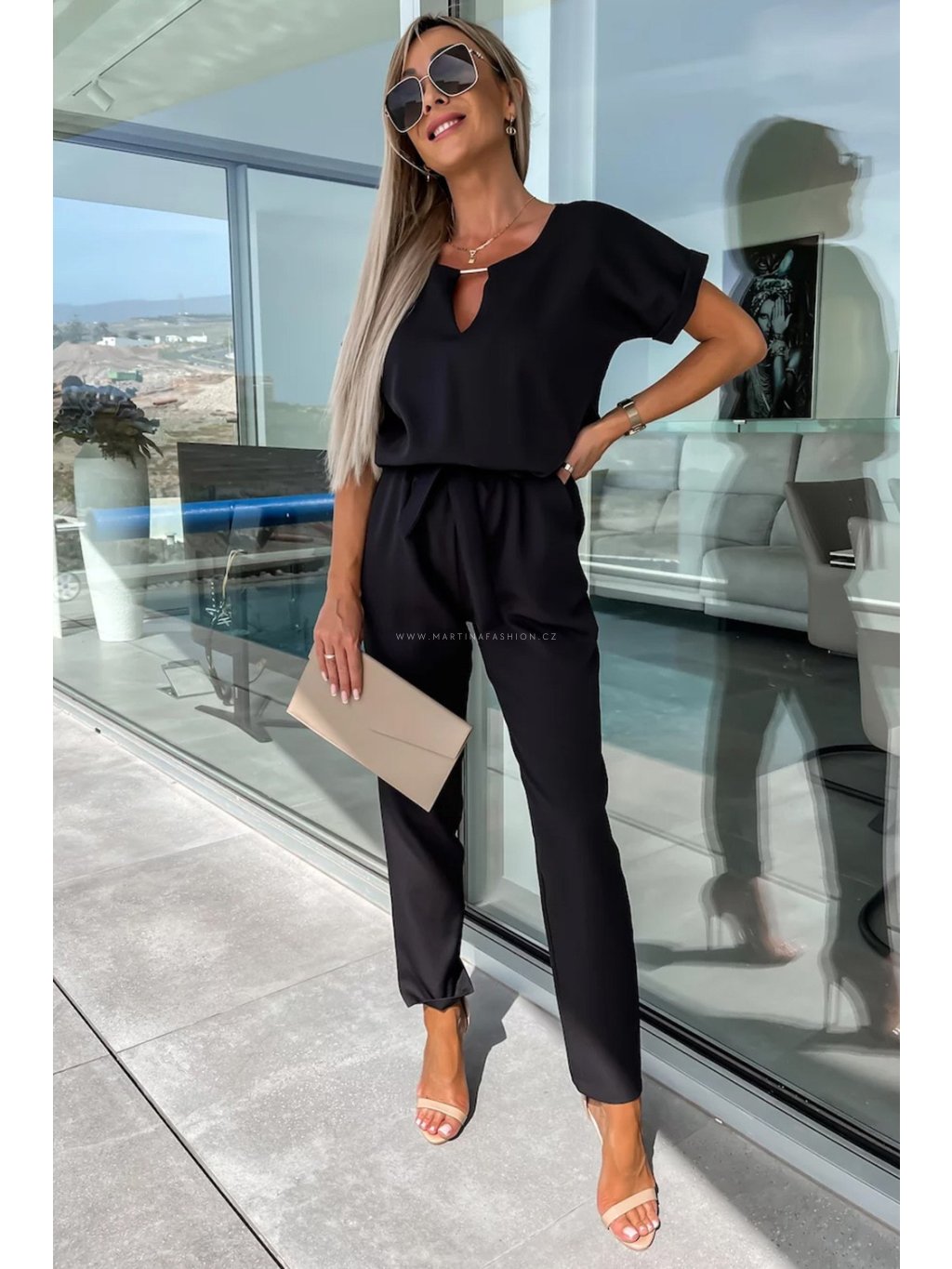 Elegantní overal s krátkým rukávem, páskem a lehkým výstřihem. Skvělá volba do práce i na společenské události.