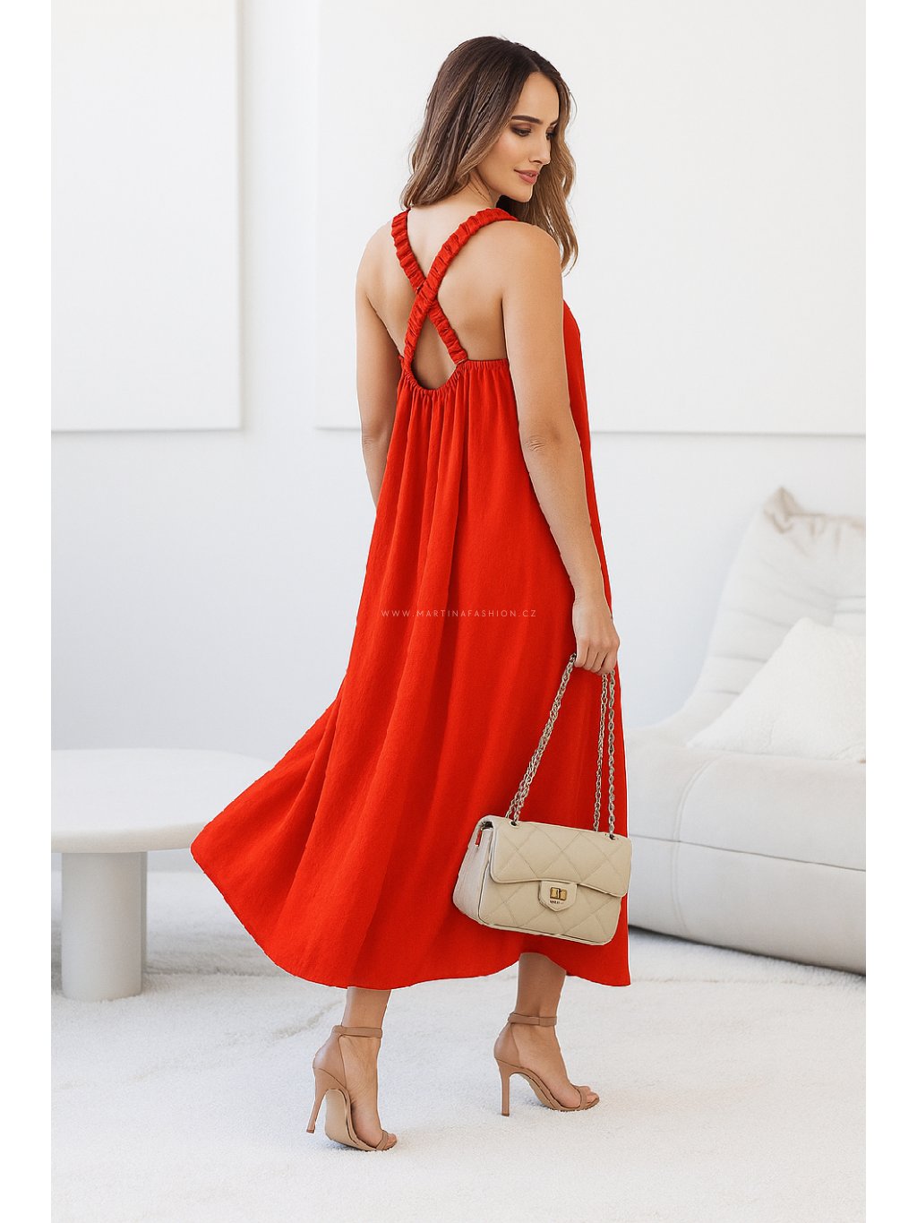 Maxi šaty na ramínka jsou dokonalou volbou pro horké letní dny i večerní procházky. Volný střih působí elegantně, ale zároveň maximálně pohodlně. Díky lehkému a prodyšnému materiálu se v nich budete cítit svěže i během teplého počasí. Výrazná zadní část s překříženými ramínky dodává šatům zajímavý detail a originální vzhled. Snadno kombinovatelné s různými typy obuvi – od sandálů po lodičky.