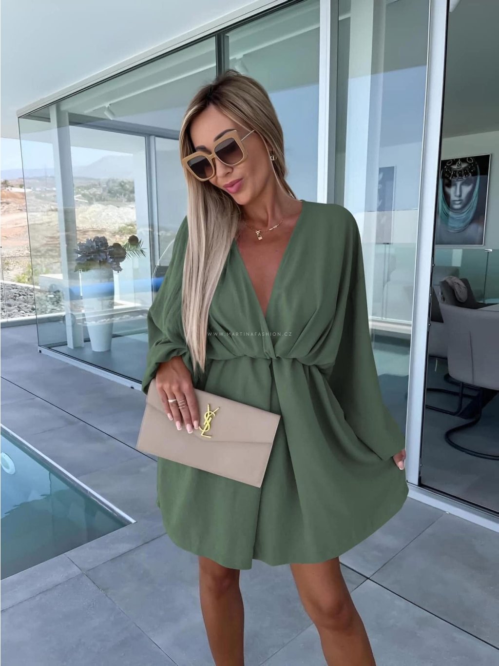 Elegantní minišaty s volnými rukávy a efektním překřížením v pase.