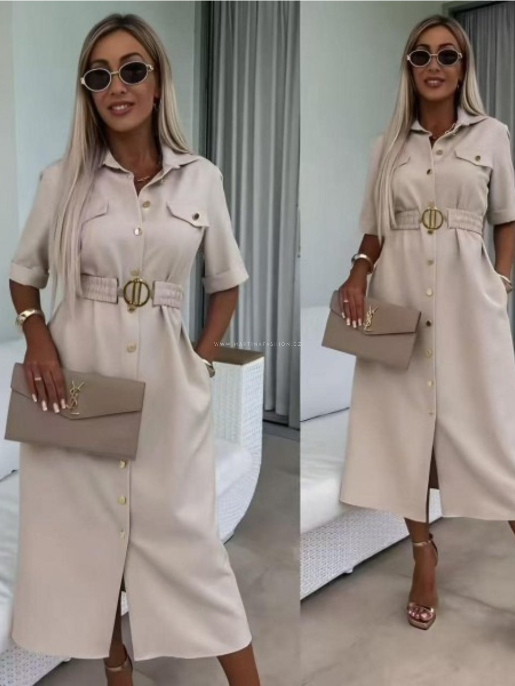 Stylové košilové midi šaty s páskem, krátkým rukávem a zapínáním na knoflíky po celé délce.