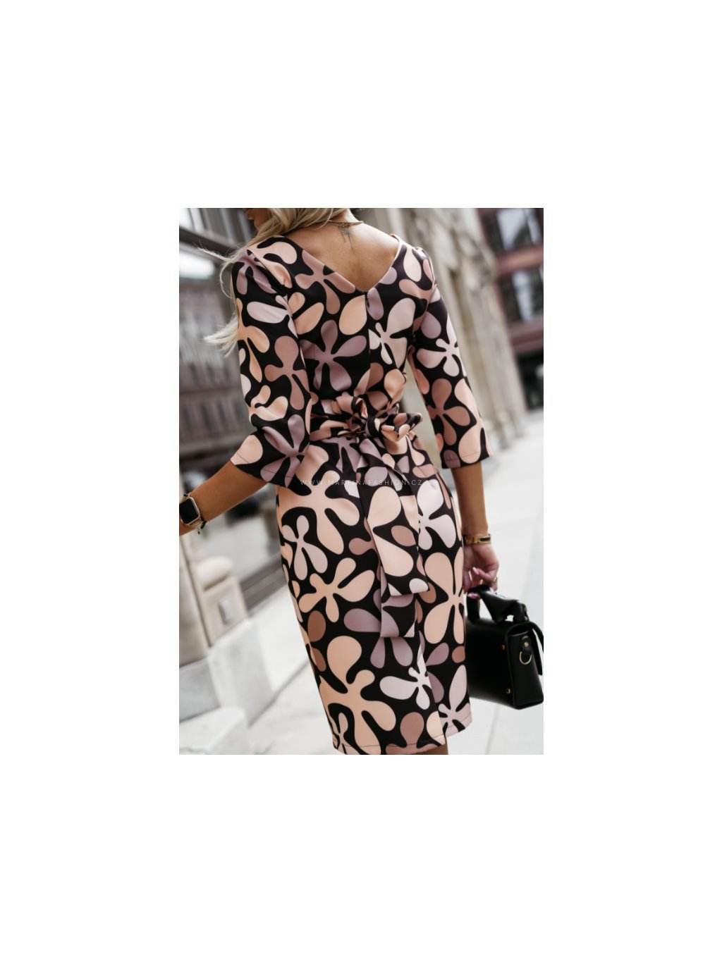 Elegantní šaty s tříčtvrtečními rukávy a rafinovaným páskem ve stejném vzoru. Mírně elastický materiál zajišťuje pohodlí při nošení a zároveň krásně drží tvar. Vhodné jak do práce, tak i na společenské události.