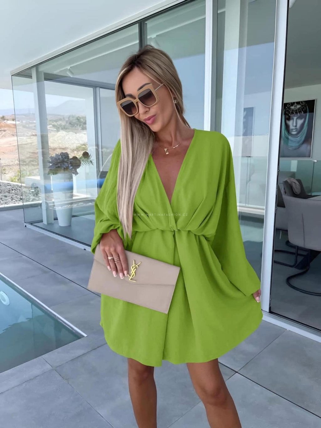 Elegantní minišaty s volnými rukávy a efektním překřížením v pase.