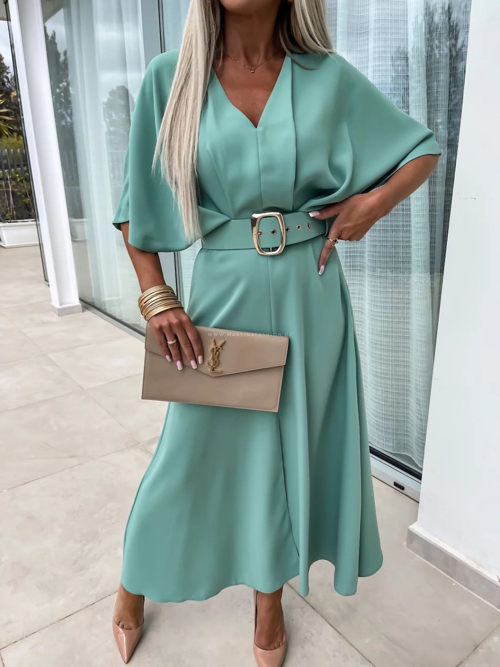 Elegantní maxi šaty s výrazným páskem, širokými rukávy a výstřihem do V.