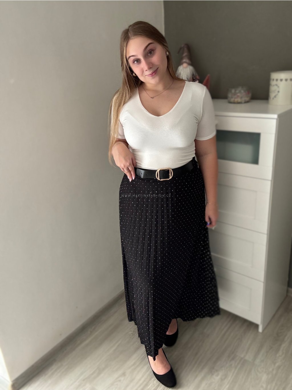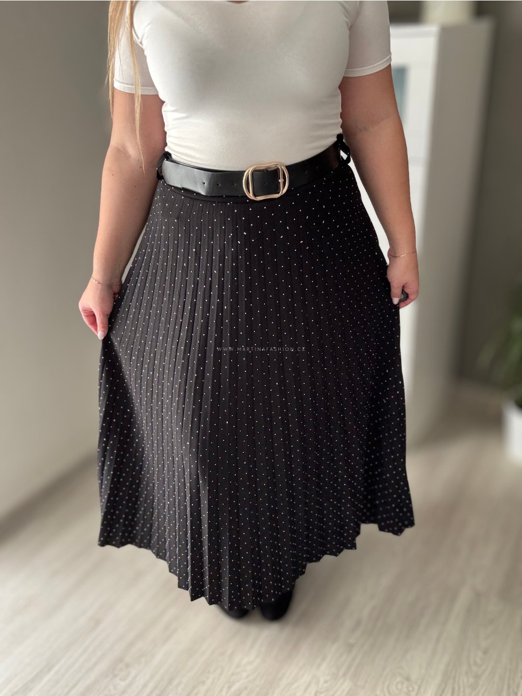 Elegantní plisovaná sukně s jemnými kamínky působí žensky, lehce slavnostně a krásně se vlní při každém kroku. Součástí je také stylový pásek, který zvýrazní pas a dodá outfitu upravený vzhled. Materiál je příjemný, splývavý a ideální jak k halence, tak k obyčejnému tričku nebo svetříku.