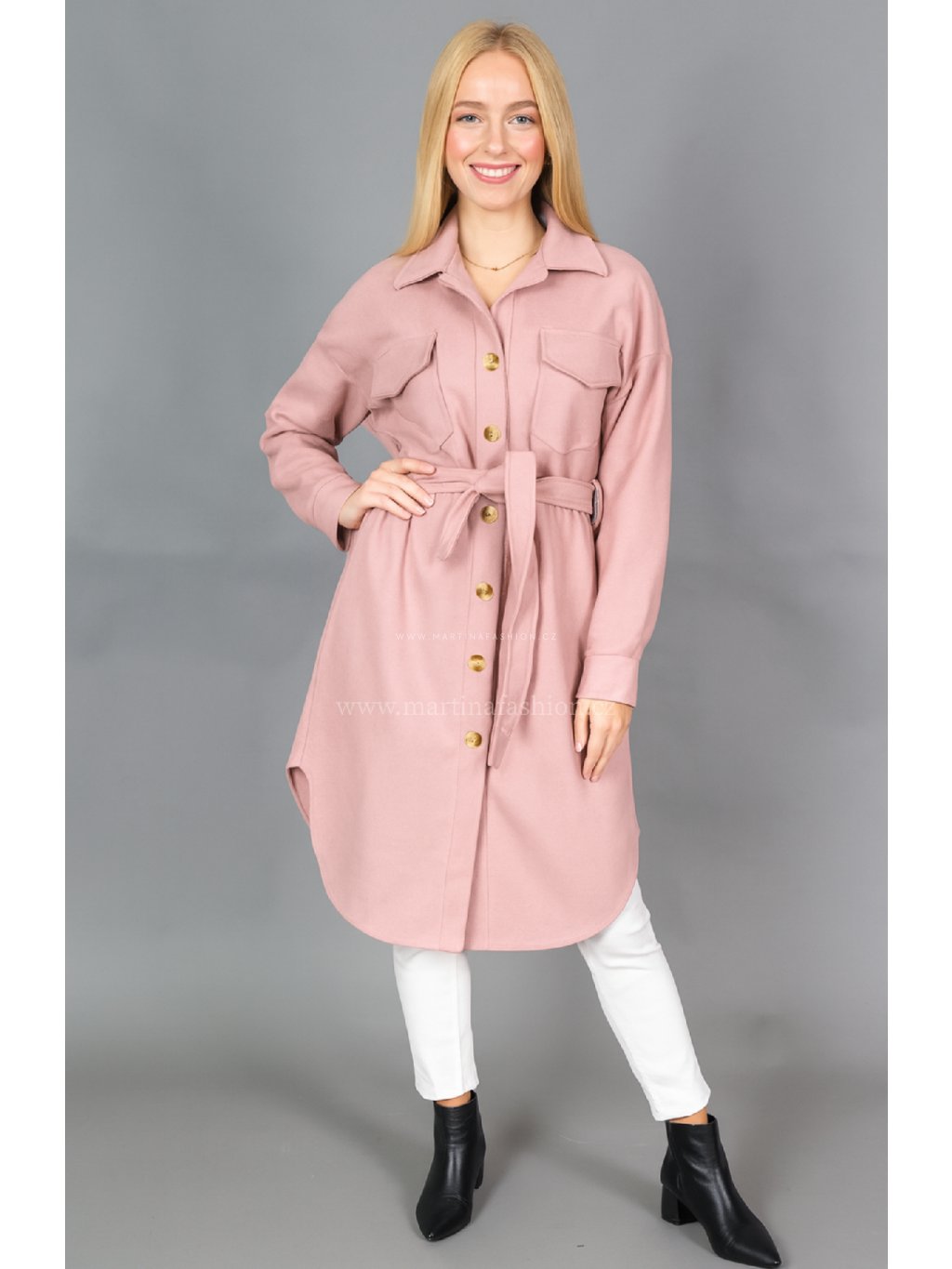 Elegantní podzimní kabát košilového střihu se semišovým vzhledem. Vhodný na každodenní nošení i do práce, krásně drží tvar a opticky zeštíhluje díky zavazování v pase.