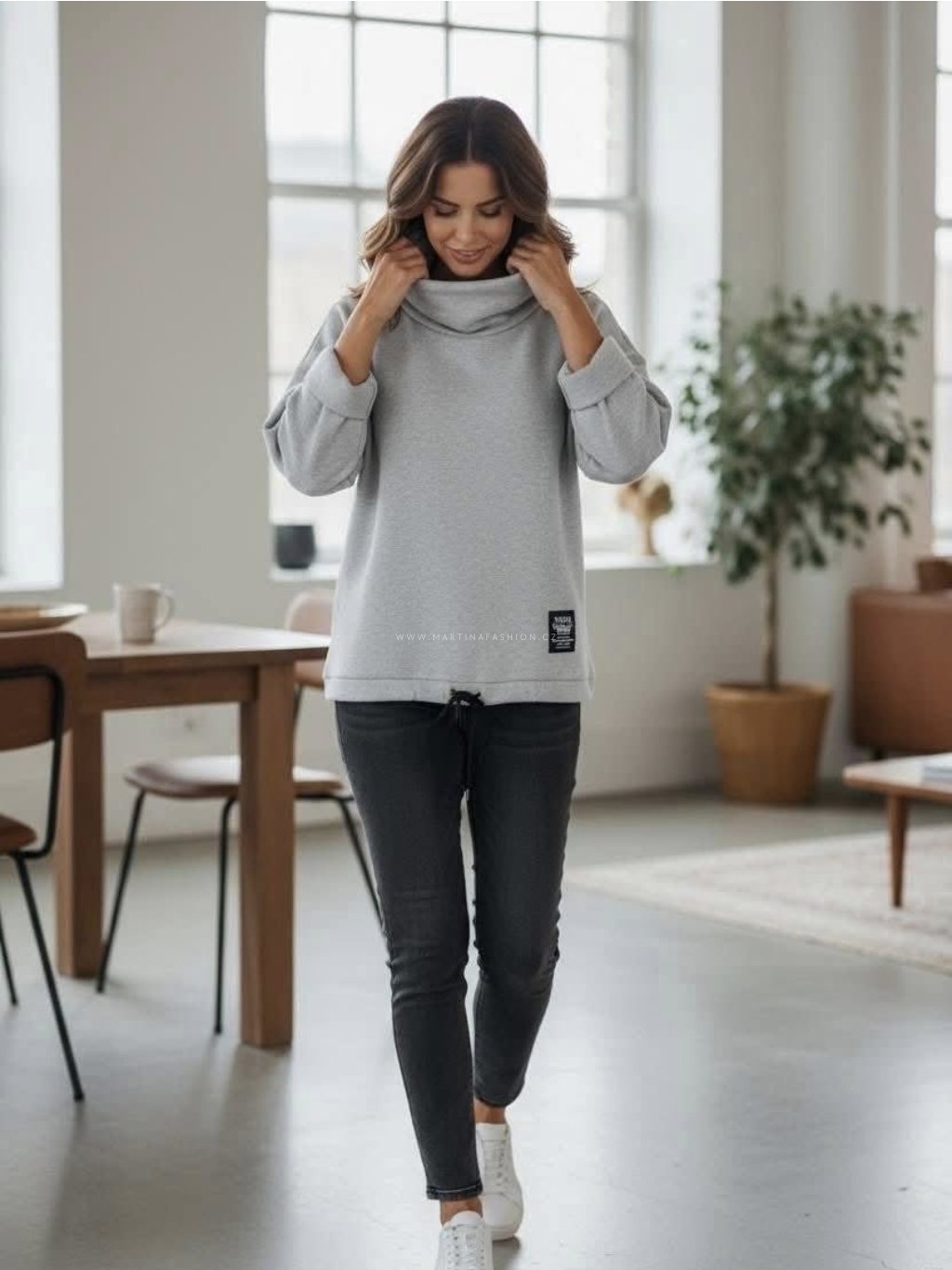 Mikina MAREN je moderní a pohodlný kousek, který díky volnému střihu a příjemnému materiálu lichotí různým typům postavy. Má široký rolákový límec, který působí elegantně a zároveň krásně hřeje. Spodní lem je na stahování, takže si můžete snadno upravit délku i tvar podle sebe – nosit ji volně, nebo jemně vytvarovat siluetu.