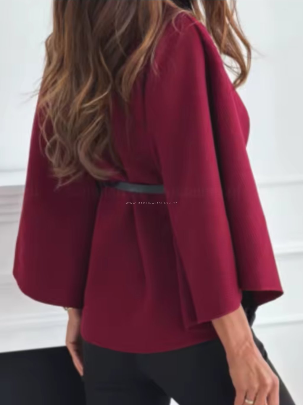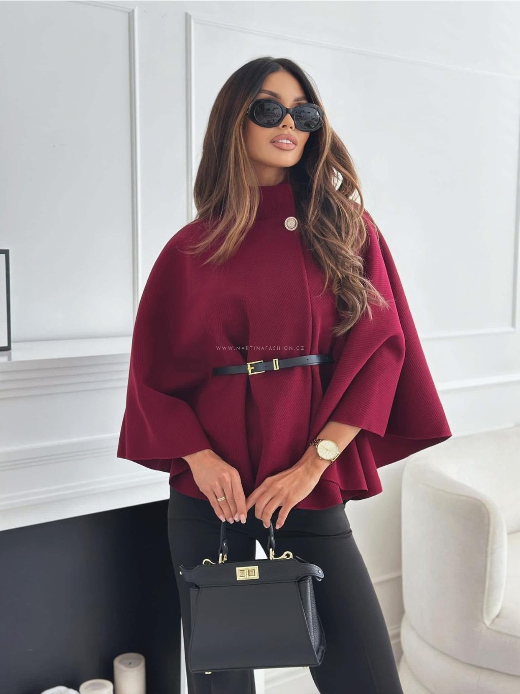 Vínové elegantní pončo - kabátek MAELIE s páskem